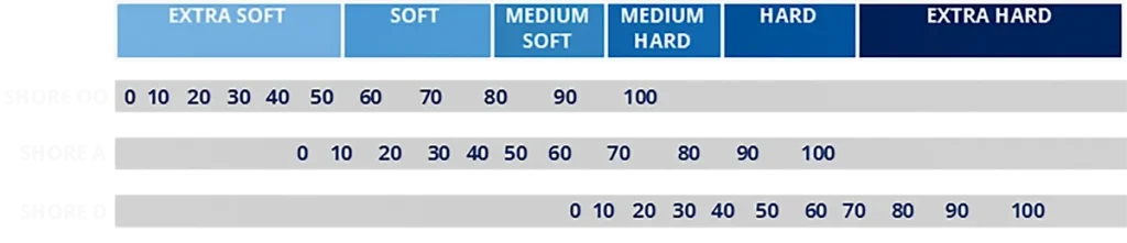 - Shore 00 is typically used for soft and flexible materials such as gels, soft foams, and highly flexible rubbers.
